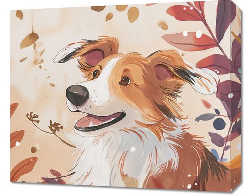 Obraz z serii wnętrza zatytułowany Collie Jesienną Porą. Na obrazie widnieje obraz psa rasy Border Collie, który z radością spogląda w bok, otoczony przez jesienne liście i gałązki, co oddaje sezonową zmianę i ciepło jesiennych kolorów. Psiak ma błyszczącą sierść w odcieniach bieli, karmelu i brązu, a jego uśmiechnięta mordka i łagodne oczy odzwierciedlają beztroski i radosny duch. Tło obrazu jest neutralne z akcentami czerwieni, pomarańczy i złota, co dodaje kompozycji życia i głębi. Ten plakat będzie idealnym dodatkiem do każdego wnętrza, szczególnie do pokojów dziecięcych, salonów lub kawiarni, oferując poczucie ciepła i spokoju, a także sprawdzi się jako prezent dla miłośników psów i miłośników przyrody.