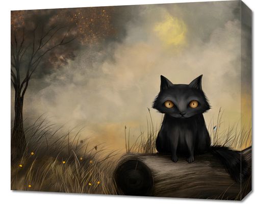 Obraz z serii abstrakcja zatytułowany Czarny Kot. Przedstawia on czarnego kota o hipnotyzujących, złotych oczach, siedzącego na polanie w ciepłych promieniach zachodzącego słońca. Drzewo o gołych gałęziach i delikatne światła odbijające się w tle tworzą atmosferę tajemniczości i spokoju. Złote i brązowe odcienie sceny, połączone z subtelnymi akcentami świetlnymi, nadają ilustracji uczucie ciepła i spokojnej zadumy.Ten obraz będzie doskonałym dodatkiem do wnętrz, które pragną wprowadzić element spokoju i kontemplacji, idealny do salonu, sypialni czy gabinetu. Zapewnia on poczucie towarzystwa i spokoju, wprowadzając do pomieszczenia ciepło i urok wieczornej aury.