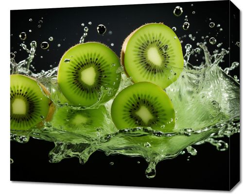 Obraz z serii wnętrza zatytułowany Energia Kiwi, przedstawia dynamiczny moment, gdy plasterki kiwi wchodzą w interakcję z rozpryskującą się wodą, tworząc wizualne spektakulum koloru i ruchu. Jasne zielenie owoców są wyraziste na tle ciemnego tła, a przezroczyste krople wody dodają kompozycji poczucia świeżości. Ten obraz przyciąga uwagę żywiołowością i świeżością, doskonale wpasowując się do przestrzeni, które pragną podkreślić zdrowy styl życia, takich jak kuchnie, jadalnie, studia fitness, spa, a także jako energetyzujący akcent w nowoczesnych biurach lub kawiarniach.