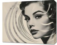 Obraz z serii pop art zatytułowany Ikonka Kina. Przedstawia czarno-białe portretowe zdjęcie klasycznej gwiazdy filmowej, której twarz jest częściowo zakryta przez geometryczny wzór spiralnych linii. Linie te dodają obrazowi dynamiki i nowoczesnego akcentu, kontrastując z retro estetyką portretu. Ten obraz łączy stare z nowym, sugerując zarówno ponadczasową piękność, jak i współczesne spojrzenie na sztukę. Idealny do eleganckich, miejskich przestrzeni lub jako dekoracja dla miłośników klasycznego kina.