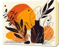 Obraz z serii minimalistyczne zatytułowany Jaskrawy Zachód. Na grafice widnieje silnie stylizowany motyw roślinny, gdzie czarne sylwetki roślin kontrastują z jaskrawo pomarańczowym i żółtym tłem, przypominającym zachodzące słońce. W tle pojawiają się delikatne, abstrakcyjne linie i kształty, dodające kompozycji głębi i tekstury.Ten plakat doskonale wpasuje się w wnętrza ożywione roślinnością, zarówno te domowe, jak i komercyjne przestrzenie typu kawiarnie lub sklepy z roślinami. Jego ciepłe barwy będą wprowadzać przytulną atmosferę i mogą stanowić żywy akcent w przestrzeniach utrzymanych w naturalnej kolorystyce.