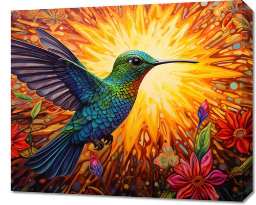Obraz z serii abstrakcja zatytułowany Koliber Barw. Na obrazie widnieje kolorowy, żywy obraz kolibra w locie, z rozpostartymi skrzydłami, na tle promieniującego słońca. Ptak jest przedstawiony w pełnym kolorze, z odcieniami zieleni i błękitu błyszczącymi na jego piórach, co nadaje mu niemal jubilerską jakość. Wokół kolibra roztacza się bujne otoczenie z kwitnącymi, różnorodnymi kwiatami w ciepłych odcieniach czerwieni i różu, które dodają kompozycji życia i głębi. Słońce w tle, z jego dynamicznymi, płomienistymi promieniami, podkreśla dynamizm i energię sceny. Obraz ten jest wizualnym przedstawieniem piękna i delikatności natury, idealny do wnętrz, które pragną wprowadzić elementy natury w sposób artystyczny i barwny, a także może służyć jako inspiracja i źródło pozytywnej energii.
