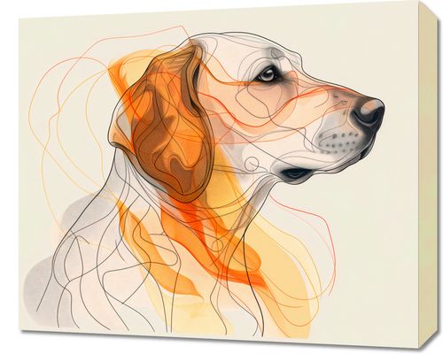 Obraz z serii abstrakcja zatytułowany Kontur Profilowego. Obraz przedstawia portret psa w stylu artystycznym, z subtelnie zaznaczonymi, ale wyraźnymi cechami. Kompozycja łączy realistyczne detale takie jak oczy, nos i uszy z abstrakcyjnymi, płynnymi liniami i plamami kolorów, które tworzą wrażenie ruchu i głębi. Dominujące kolory to odcienie pomarańczowego, żółtego i brązu, które idealnie oddają ciepło i przyjazny charakter zwierzęcia. Tło w neutralnym, pastelowym odcieniu podkreśla i równoważy bardziej dynamiczne elementy grafiki. Obraz emanuje spokojem i może wzbudzać pozytywne emocje, będąc jednocześnie wyrafinowanym, artystycznym przedstawieniem psa, który może być ulubieńcem rodziny lub po prostu przykuwającym uwagę elementem dekoracyjnym.