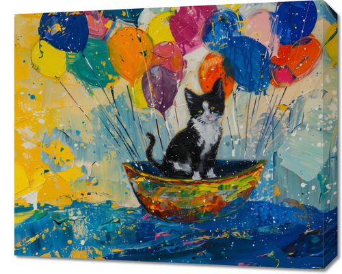 Obraz z serii abstrakcja zatytułowany Kot na Łodzi. Przedstawia on małego, czarno-białego kota siedzącego w malutkiej, kolorowej łódce, unoszącej się na żywych, błękitnych falach. Nad łódką unosi się bujny klaster jasnych, kolorowych balonów, które dodają obrazowi elementów wesołości i lekkości. Praca jest pełna energii, z widocznymi na całej powierzchni obrazu śladami energicznych pociągnięć pędzlem i plam farby, co nadaje dziełu nieco abstrakcyjny i ekspresyjny charakter. Ta mieszanka realistycznych i fantastycznych elementów tworzy ciepłą i zapadającą w pamięć scenę, która może wywoływać uśmiech i poczucie radości.