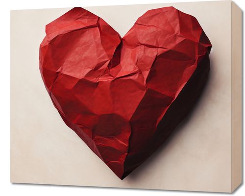 Obraz z serii wnętrza zatytułowany Kreślone Serce. Delikatne fałdy czerwonego papieru układają się w kształt serca, symbolizując skomplikowane, ale głębokie emocje. Nieregularne załamania i zgięcia dodają obrazowi tekstury i głębi, przypominając o wrażliwości i kruchości ludzkich uczuć. Pastelowe tło kontrastuje z intensywną czerwienią, podkreślając subtelność i ciepło kompozycji. Ten wyjątkowy i wzruszający projekt doskonale pasuje do romantycznych sypialni, salonów relaksacyjnych, a także miejsc związanych z terapią emocjonalną i sztuką.