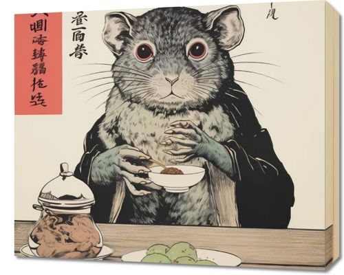 Obraz z serii motywy wschodnie zatytułowany Kulinarne Rozważania. Intrygujące spojrzenie wiewiórki, podkreślane przez wyraziste czerwone oczy i szczegółową sierść, skontrastowane z tradycyjnymi chińskimi znakami, dodającego atmosfery tajemniczości i refleksji. Na stole widzimy starannie podane potrawy, które w połączeniu z urokliwym zachowaniem postaci, tworzą obraz pełen kulturowego bogactwa. Doskonale sprawdzi się w azjatyckich restauracjach serwujących tradycyjne potrawy oraz w galeriach sztuki inspirowanej kulturą wschodu.