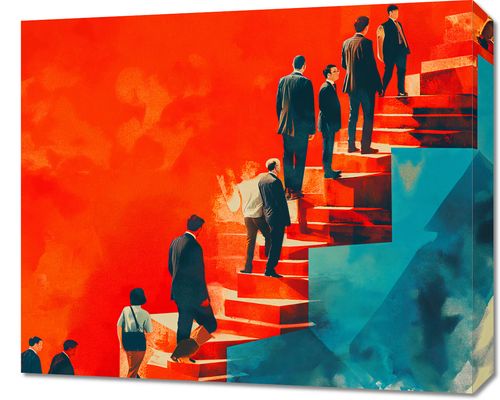 Obraz z serii abstrakcja zatytułowany Metafory Sukcesu. Przedstawia on różne postacie w formalnym ubiorze, wchodzące i schodzące po schodach, które rozdzielają się i zbiegają w różnych kierunkach. Tło obrazu jest podzielone na dwie kontrastujące strony - jedna w odcieniach czerwieni, a druga w chłodnych błękitach, symbolizując różne ścieżki i wybory w życiu zawodowym lub osobistym. Styl graficzny łączy elementy abstrakcyjne i figuralne, a silne kontrasty kolorystyczne podkreślają dynamikę i złożoność podejmowanych decyzji. Obraz ten mógłby być inspirującym dodatkiem do biura lub przestrzeni pracy, zachęcającym do refleksji nad własnym rozwojem i aspiracjami.