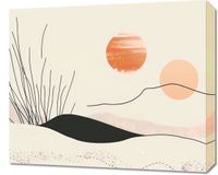 Obraz z serii boho zatytułowany Miękkie Wzgórze. Przedstawia on poetycką interpretację zachodzącego słońca, gdzie delikatne linie roślin wyłaniają się z miękkich, falujących wzgórz. Paleta kolorów to ciepłe odcienie beżu, różu oraz akcenty silniejszego pomarańczu i głębokiej czerni, które razem tworzą kojącą i spokojną atmosferę. Abstrakcyjne słońca o różnych odcieniach i wielkościach dodają kompozycji głębi i perspektywy. Ten obraz doskonale sprawdzi się jako akcent dekoracyjny w przestrzeniach, które mają być miejscem relaksu i odprężenia. Jego spokojna kolorystyka i delikatne linie będą komplementować wnętrza takie jak sypialnie, pokoje medytacyjne, gabinety relaksacyjne lub każde miejsce, które chce celebrować spokój i cichą elegancję.