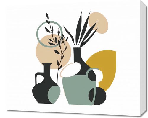 Plakat z serii minimalistyczne zatytułowany Modernistyczna Kompozycja. Grafika ta przedstawia stylizowane wazony w tonacjach czerni i zgaszonego zielonego, wypełnione abstrakcyjnymi roślinami. Tło tworzy gra geometrycznych kształtów i pastelowych barw, takich jak beż i musztardowy, co nadaje całości współczesnego, a zarazem ponadczasowego wygląduIdealnie pasowałby do wnętrz utrzymanych w duchu współczesnego minimalizmu, takich jak nowoczesne salony, minimalistyczne biura, czy loftowe przestrzenie. Świetnie sprawdziłby się również jako akcent w przestrzeniach, gdzie dominuje surowy beton lub eksponowane są naturalne elementy, takie jak drewniane belki czy ceglane ściany. Dzięki swojej prostocie i elegancji, plakat może stać się subtelnym, ale wyraźnym elementem dekoracyjnym.