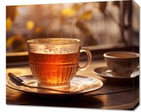 Obraz z serii wnętrza zatytułowany Moment Codzienności. Urokliwy obraz dwóch filiżanek herbaty, z których jedna uchwycona jest w chwili, gdy promienie porannego słońca przenikają przez jej bursztynową zawartość. Ciepłe światło i delikatna para unosząca się nad napojem emanuje atmosferę spokoju i przyjemności z porannego rytuału. Idealny do kuchni lub jadalni, aby dodać uczucie ciepła i domowego komfortu, a także doskonały jako prezent dla każdego miłośnika herbaty lub momentów refleksji.
