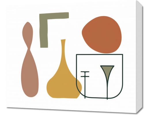 Obraz z serii boho zatytułowany Naczynia. Obraz prezentuje kolekcję abstrakcyjnych form, które przypominają różne przedmioty od naczyń po elementy dekoracyjne, tworząc estetyczną mieszankę linii i kształtów. Zestawienie spokojnych, pastelowych barw z silnymi, geometrycznymi figurami tworzy wizualnie przyjemną kompozycję, która zwraca uwagę swoją subtelną elegancją. To dzieło artystyczne jest doskonałym wyborem dla wnętrz o nowoczesnym designie, w których chcemy wprowadzić sztukę bez dominujących nad przestrzenią. Idealnie sprawdzi się jako delikatny akcent w przestronnym salonie, biurze czy jako część galerii w domowym korytarzu.