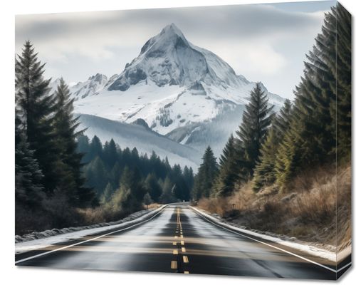 Obraz z serii pejzaże zatytułowany Odważna Podróż, przedstawia majestatyczną górę wyłaniającą się z pośród ciemnozielonych drzew iglastych, które wyznaczają drogę prowadzącą w kierunku jej śnieżnego szczytu. Siła i niezachwiana postawa góry w połączeniu z miękkimi konturami puchowych chmur nad nią tworzą doskonałą równowagę między wytrwałością a delikatnością. Czarna, wilgotna nawierzchnia drogi, rozświetlona światłem odbijającym się od jej wilgotnej powierzchni, prowadzi wzrok obserwatora wprost do serca dzikiej przyrody. Kontrast między ciemnymi drzewami a bielą śniegu dodaje dziełu głębi i tajemniczości. Ten obraz będzie idealnym dodatkiem do wnętrz o tematyce przygodowej i eksploracyjnej, jak również doskonałym wyborem dla przestrzeni biurowych firm turystycznych lub agencji podróżniczych, gdzie może inspirować i przypominać o majestacie i pięknie niezbadanych zakątków świata.