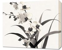 Obraz z serii wnętrza zatytułowany Orchidea. Na obraz widoczna jest stylizowana kompozycja kwiatów orchidei, przedstawiona w monochromatycznej kolorystyce. Dominują odcienie bieli i czerni, które tworzą silny kontrast, podkreślający delikatne kształty i szczegóły płatków oraz ciemniejsze środki kwiatów. Liście i łodygi są przedstawione w odcieniach szarości, co dodaje głębi i tekstury do obrazu. Całość kompozycji jest elegancka i nowoczesna, z subtelnymi gradientami i cieniowaniem dla realizmu. Tło jest jasne, co sprawia, że kwiaty wydają się jeszcze bardziej wyraziste. Ten obraz może być interpretowany jako połączenie naturalnego piękna z minimalistyczną estetyką, idealne do nowoczesnych wnętrz, które cenią sobie prostotę i elegancję.