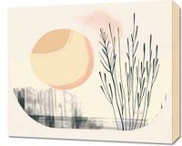 Obraz z serii boho zatytułowany Pastelowy Wschód. Obraz ukazuje subtelny, linearny rysunek roślinności na tle dużego, pastelowego słońca i delikatnie zaznaczonych elementów krajobrazu. Kompozycja w pastelowych, ciepłych barwach tworzy wrażenie spokojnego wschodu słońca, który rozświetla delikatne kontury roślin i miękkie formy w tle. Obraz ten idealnie wpasuje się do wnętrz o stonowanej kolorystyce, gdzie może dodać odrobinę ciepła i subtelnego charakteru. Doskonale nadaje się do sypialni, salonów, czy innych miejsc odpoczynku, gdzie wprowadzi łagodny nastrój i poczucie wyciszenia.