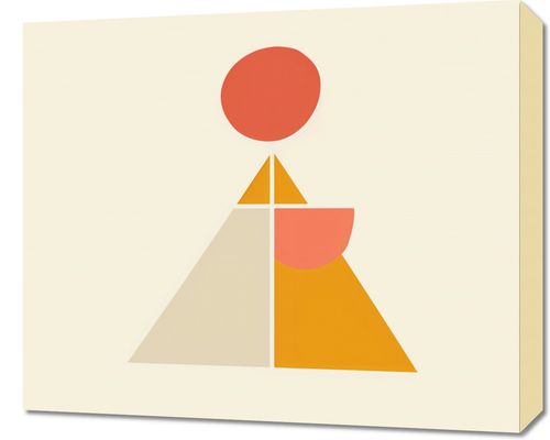 Obraz z serii boho zatytułowany Piramida Równowagi.Na obrazie widnieje uproszczona, ale wyrazista kompozycja geometryczna, składająca się z trójkąta podzielonego na mniejsze sekcje, półkola oraz kółka na szczycie. Kolorystyka utrzymana w pastelowych odcieniach beżu, pomarańczy i czerwieni, wprowadza poczucie ciepła i spokoju.Dzieło idealnie wpisuje się w minimalistyczne i nowoczesne przestrzenie, stanowiąc zarazem element medytacyjny jak i dekoracyjny. Dopełnieniem mogą być proste, drewniane ramy, które podkreślą naturalność prezentowanej formy. Jest to obraz, który może znaleźć swoje miejsce w domowym biurze, salonie, a nawet w przestrzeniach komercyjnych, takich jak kawiarnie lub poczekalnie.