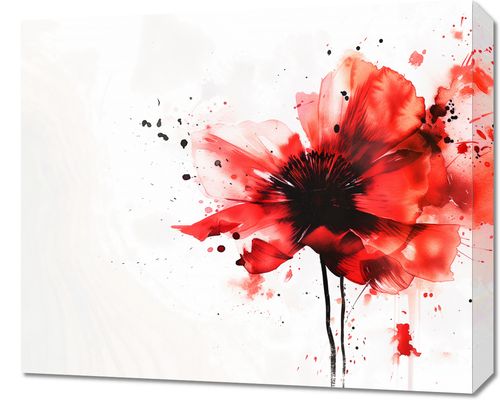 Obraz z serii abstrakcja zatytułowany Płynna Akwarela. Na obrazie przedstawiony jest kwiat w stylu akwarelowym, z dominującą czerwoną paletą barw, która przechodzi w mocne akcenty czerni w centrum kwiatu. Obraz ma dynamiczny i spontaniczny charakter, co podkreślają rozbryzgi i krople farby rozchodzące się wokół kwiatu. Przypomina to efekt plamy, który dodaje kompozycji artystycznego wyrazu i energii. Kontrast między delikatnymi czerwieniami a głęboką czerń centrum kwiatu przyciąga wzrok i czyni obraz bardzo wyrazistym. Tło jest jasne z subtelnie zaznaczonymi plamami, co dodatkowo akcentuje dramatyzm i piękno przedstawionego kwiatu.