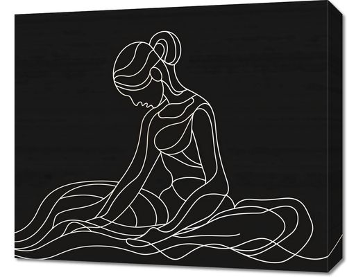 Obraz z serii wnętrza zatytułowany Pozycja Siedząca. Przedstawia minimalistyczny, linearny rysunek kobiety w pozycji siedzącej, wykonany białą linią na ciemnym tle. Praca artystyczna charakteryzuje się prostotą i elegancją, z postacią zredukowaną do serii płynnych, ciągłych linii, które tworzą zarówno kontury zewnętrzne, jak i subtelne detale ciała i stroju. Delikatny gęstwin linii w dolnej części obrazu sugeruje fałdy tkaniny, dodając wrażenia głębi i miękkości do kompozycji. Postać kobiety, z głową lekko pochyloną w dół, wyraża spokój i kontemplację. Obraz ten, z jego czystymi liniami i zrelaksowanym motywem, może wprowadzić atmosferę spokoju i wyciszenia do każdego nowoczesnego wnętrza, nadając mu jednocześnie artystycznego charakteru.