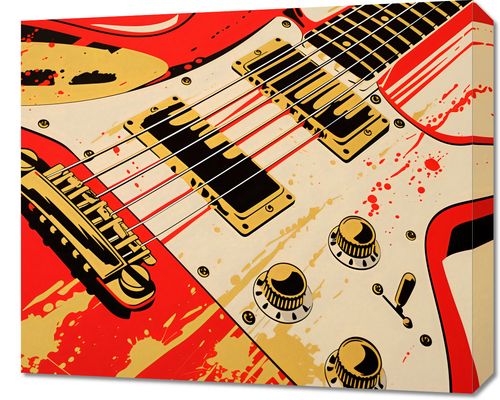 Obraz z serii abstrakcja zatytułowany Przed Graniem. Przedstawia zbliżenie na czerwoną gitarę elektryczną, której design jest wyrazisty i pełen energii. Widać detale instrumentu, takie jak przetworniki, potencjometry i struny, które są wyraźnie zaznaczone kontrastującymi kolorami złota, czerni i bieli na tle intensywnej czerwieni. Rozpryski i plamy farby na korpusie gitary nadają plakatowi surowy, rockowy charakter, co może sugerować żywiołowość i pasję muzyki granej na tym instrumencie. Ten obraz mógłby być atrakcyjnym elementem dekoracyjnym w przestrzeniach dedykowanych muzyce, takich jak sale prób, studia nagraniowe, pokoje młodzieżowe lub jako odważny akcent w nowoczesnym salonie.