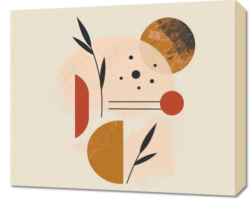 Obraz z serii boho zatytułowany Przyrost do Tła.Obraz przedstawia abstrakcyjną kompozycję złożoną z prostych, geometrycznych form i roślinnych motywów. Dominują tutaj ciepłe odcienie pomarańczowego, różu i brązu, które mieszają się z czernią i beżem. Na pierwszym planie mamy elementy roślinne, które mogą przypominać liście lub gałązki, zaś w tle znajdują się różnej wielkości i faktury koła. Całość jest stylizowana i uproszczona, co daje efekt współczesnego, designerskiego dzieła sztuki. Plakat może inspirować poczuciem spokoju i natury, jednocześnie zachowując modernistyczne uczucie. Idealnie wpasuje się w nowoczesne wnętrze jako centralny punkt dekoracyjny lub delikatne uzupełnienie estetyczne.