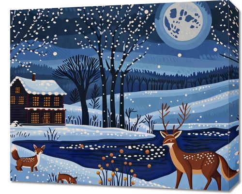 Obraz z serii abstrakcja zatytułowany Przyszła Zima. Obraz przedstawia malowniczą, zimową scenę w stylistyce folklorystycznej. Na obrazie dominują chłodne odcienie niebieskiego, tworząc nocny krajobraz pokryty śniegiem. Centralny motyw stanowi dom z oświetlonymi oknami, co nadaje scenie ciepły, przytulny akcent. Śnieg delikatnie opada na drzewa i dach domu, a pełnia księżyca rozświetla niebo, odbijając się w zamarzniętym strumieniu. Na pierwszym planie widać sylwetki zwierząt: dorosłego jelenia i młodego lisa, które dodają kompozycji naturalnego życia i ruchu. Tło przedstawia malownicze wzgórza i lasy, co współgra z idyllicznym, spokojnym nastrojem obrazu. Scena ta wywołuje uczucie spokoju i cichej radości, sprawiając, że plakat ten jest idealny do dekoracji wnętrz w zimowym okresie, dodając im ciepła i uroku.