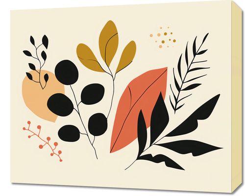 Obraz z serii minimalistyczne zatytułowany Różnorodność Stylu. Ten piękny obraz przedstawia różnorodność roślin w stylizowanej formie, z łagodnymi krzywiznami i eleganckimi liniami na spokojnym tle. Kolorystyka jest ciepła i naturalna, z dominującymi odcieniami ochry, czerwieni i czerni, które razem tworzą kojącą i zrównoważoną paletę. Obraz doskonale wpasuje się w przestrzenie, które chcą wyrazić spokój i harmonię poprzez sztukę. Może ozdobić ściany domowego salonu, sypialni, kącika do czytania, czy też dodać akcentu naturalnego piękna do biurowego otoczenia.