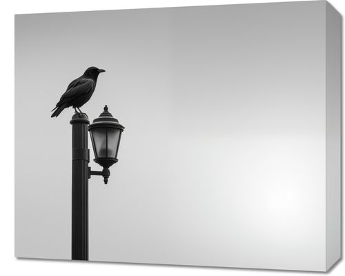 Obraz z serii wnętrza zatytułowany Samotny Postój Kruka. Prezentuje on sylwetkę kruka spoczywającego na klasycznej latarni ulicznej, uchwyconą w monochromatycznej palecie szarości. Ten spokojny, lecz sugestywny obraz jest symbolem refleksji i tajemnicy, doskonale wpisując się w klimat współczesnych przestrzeni miejskich. Praca ta z pewnością stanie się wyrazistym dodatkiem do nowoczesnych wnętrz, takich jak lofty czy minimalistyczne salony, a także wniesie element zastanowienia do przestrzeni publicznych takich jak galerie, kawiarnie i biblioteki, gdzie odosobnienie miesza się z miejskim zgiełkiem.