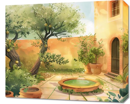 Obraz z serii abstrakcja zatytułowany Słoneczny Dzień. Obraz ukazuje idylliczny ogród w ciepły, słoneczny dzień. Widoczna jest część kamiennego patio otoczonego bujną roślinnością, z dojrzałymi cytrynami wiszącymi na gałęziach niewielkich drzew. W centrum kompozycji znajduje się dekoracyjny kamienny basen z delikatnym strumieniem wody. Na pierwszym planie widać donice z różnorodnymi roślinami, które dodają scenie domowego ciepła. Jaskrawość słońca jest złagodzona przez liście drzew, tworząc wzorzyste cienie na płytach chodnika. Architektura w tle, z żółtymi ścianami i ciemnymi drewnianymi drzwiami, współgra z naturalną paletą kolorów ogrodu. Atmosfera obrazu jest spokojna i relaksująca, sugerująca miejsce ucieczki i odpoczynku.