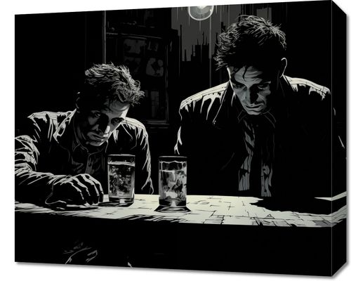 Obraz z serii abstrakcja zatytułowany Spiskowcy. Ta grafika przedstawia dwóch mężczyzn zanurzonych w głębokiej konwersacji przy barowym stole. Stylizacja na czarno-biało uchwyciła napięte, dramatyczne oświetlenie i cienie, które nadają scenie klimat tajemniczości i suspensu. Wyraźne kontury i kontrastowe światłocienie podkreślają wyraziste postaci mężczyzn i ich zacięte postawy. Obraz ten przemawia do miłośników klasycznego kina i literatury, doskonale nadając się do dekoracji przestrzeni o męskim charakterze, takich jak prywatne gabinety, domowe bary czy miejsca spotkań.