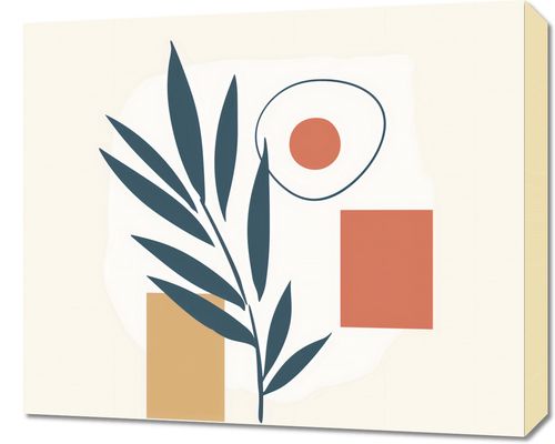 Obraz z serii boho zatytułowany Splot Natury.Obraz to subtelne połączenie abstrakcyjnych form i motywów przyrodniczych. Ciepłe, stonowane kolory tworzą delikatne tło dla wyrazistych, ciemnozielonych liści. Geometryczne kształty, w tym okrąg z centralnie umieszczonym punktem, przypominają stylizowane oko, które wraz z prostokątem w ciepłym kolorze tworzy kompozycję pełną spokoju i równowagi.To dzieło doskonale wpasuje się w przestrzenie, które łączą współczesny design z elementami naturalnymi, takie jak jasne salony, przestronne studia, czy strefy relaksu w domach i miejscach publicznych. Prosta paleta kolorów i elementy roślinne mogą wprowadzić wyciszającą atmosferę do sypialni lub gabinetów, gdzie design współgra z funkcją i tworzy przestrzeń do odprężenia i inspiracji.