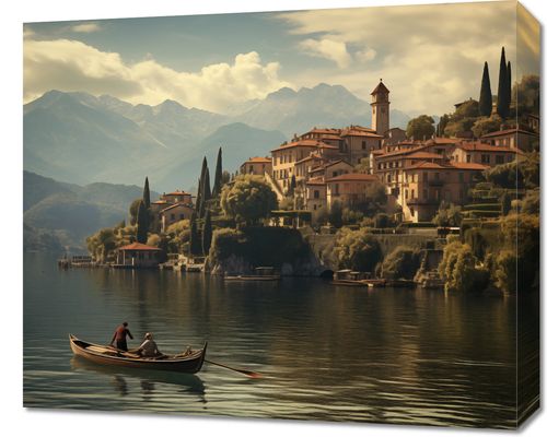 Obraz z serii pejzaże zatytułowany Spokojna Nostalgia, ten urzekający pejzaż przenosi nas do sielankowej wioski nad jeziorem, gdzie czas zdaje się płynąć wolniej. Łagodne światło rozlewające się nad architekturą wioski i gładką powierzchnią wody tworzy poczucie ciepła i spokoju. Para przemieszczająca się łodzią dodaje element ludzki, harmonijnie wpisując się w krajobraz. To dzieło sztuki idealnie nadaje się do przestrzeni, które mają na celu wprowadzenie atmosfery spokoju i refleksji, takich jak biblioteki, poczekalnie lub prywatne gabinety, zapewniając odprężającą ucieczkę od codziennego zgiełku.