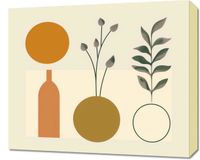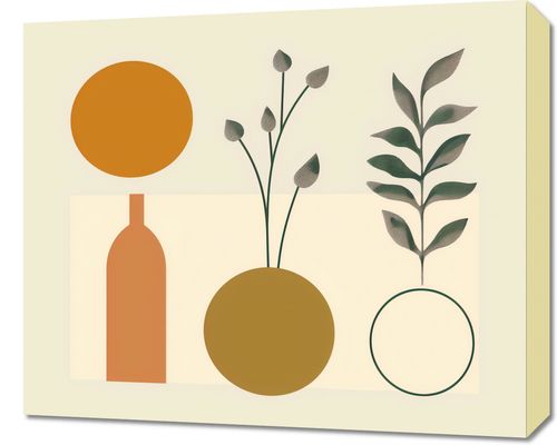 Obraz z serii boho zatytułowany Symfonia Równowagi. Obraz łączy organiczne kształty roślin z rygorystyczną formą geometrii. Prezentuje on wazony w spokojnych odcieniach brązu i złota, z których jeden jest ozdobiony gałązkami z delikatnymi pąkami, a drugi pokazuje symetryczny wzór liści. Proste linie i figury geometryczne, takie jak okrąg i prostokąt, tworzą tło dla roślinności, przypominając o ludzkiej próbie ujarzmienia natury. Całość osadzona na pastelowym tle wywołuje uczucie spokoju i harmonii. To dzieło będzie pasowało do przestrzeni, które cenią równowagę między naturą a stworzonym przez człowieka porządkiem, jak eleganckie gabinety, przestrzenie wellness lub strefy odpoczynku, które dążą do stworzenia oazy spokoju w zabieganym świecie.