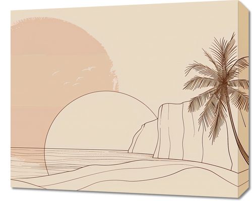 Obraz z serii minimalistyczne zatytułowany Szept Tropików. Plakat przedstawia delikatnie zarysowany krajobraz tropikalny o wschodzie lub zachodzie słońca. W centralnej części kompozycji widnieje wielki, ciepły dysk słońca, którego połowa chowa się za horyzontem. U jego podstawy majaczą delikatne linie morza, a na pierwszym planie z prawej strony wznosi się smukła palma o finezyjnie narysowanych liściach. Z lewej strony rysunek przedstawia wysokie klify, które wyłaniają się z morza, a na tle słońca można dostrzec lekkie sylwetki ptaków. Ten plakat to kwintesencja spokoju i harmonii, świetnie sprawdzi się w pomieszczeniach, które mają być oazą relaksu, takich jak salon, sypialnia czy pokój do medytacji. Jego ciepłe, pastelowe barwy i proste linie mogą również dodać elegancji i spokoju do przestrzeni biurowych, wspomagając skupienie i kreatywne myślenie.