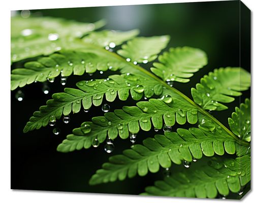 Obraz z serii natura zatytułowany Szepty Natury, prezentuje zbliżenie na liść paproci okryty kropelkami rosy, które lśnią jak drogocenne klejnoty na jego witalnie zielonej powierzchni. Delikatność każdej kropli wody, zawieszonej jakby na skraju czasu, oddaje spokój i harmonię natury, jednocześnie przywołując uczucie świeżości i ożywienia. Tło obrazu jest głębokie i jednolite, co pozwala zaakcentować jasne zieleń liści i przezroczystość wody. Ten obraz może być symbolem czystości i nowych początków, idealnie wkomponuje się w przestrzenie skoncentrowane na zdrowiu i dobrostanie, takie jak gabinety lekarskie, spa, czy też jako element dekoracyjny w łazienkach i pomieszczeniach relaksacyjnych, przynosząc uczucie spokoju i odświeżenia.
