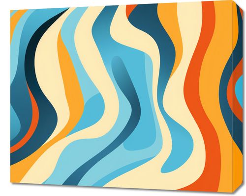 Obraz z serii abstrakcja zatytułowany Tańczące Fale. Kolorowe pasma falujące w rytmie niewidzialnej melodii, tworząc kalejdoskop błękitów, pomarańczy i beżów. Te meandryczne wzory przypominają wodne tanecznice, które wirowałyby w rytmie letniego brzasku. Ciepłe i chłodne tony kontrastują ze sobą, nadając obrazowi głębi i dynamiki. Będzie idealnym wyborem dla nowoczesnych apartamentów nad morzem, czy też kawiarni o śródziemnomorskim klimacie.
