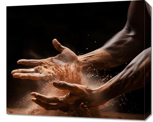 Obraz z serii wnętrza zatytułowany Taniec Ziemi. Dramatyczne zdjęcie rąk artysty, które rzucają w powietrze obłoki brunatnego pyłu, przypominającego ziemię, przeciwko głęboko czarnemu tłu. Dynamiczne ruchy, uchwycone w jednej chwili, emanują siłą i pasją, a ekspresja ciała dodaje obrazowi życia i energii. Ten plakat pasuje do przestrzeni współczesnych i kreatywnych, takich jak studia artystyczne, sale taneczne, czy też jako wyrazisty akcent w nowoczesnych biurach. Z pewnością zainteresuje osoby ceniące sztukę, ruch i ekspresję.