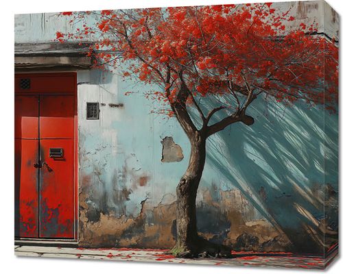 Obraz z serii wnętrza zatytułowany Widok Na Dawne. Kompozycja łączy surowość starych, połatanych ścian w stonowanych kolorach z wyrazistym czerwonym drzwiami oraz rozkwitłym drzewem o żywym karmazynowym kolorze, które zdaje się wprowadzać życie i energię do miejskiej monotonii. Promienie światła przenikające przez liście dodają głębi i tajemniczości scenie. Ten obraz doskonale wkomponuje się w przestrzenie kreatywne, galerie sztuki lub jako akcent w minimalistycznych, nowoczesnych wnętrzach, przynosząc z sobą odrobinę miejskiego romansu i poezji codzienności.