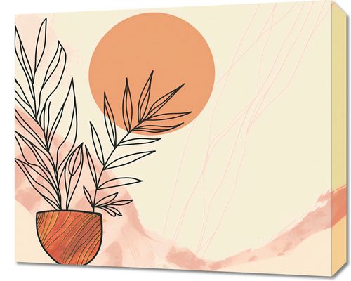 Obraz z serii minimalistyczne zatytułowany Widok nad Pustynią. Obraz przedstawia prostą, lecz wyrazistą kompozycję rośliny w glinianym doniczce na tle stylizowanego, pastelowego krajobrazu pustynnego. Wzgórza pustyni w odcieniach beżu i pomarańczu tworzą miękkie, falujące linie, nad którymi wznosi się duży, okrągły dysk słońca o intensywnej, ciepłej barwie. Delikatne linie, które wydają się emanować od słońca, przypominają ciepłe wiatry pustyni lub subtelne promienie słoneczne. Obraz ten wydaje się być idealny do ożywienia i dodania ciepła każdej przestrzeni, szczególnie tych, które są utrzymane w jasnej i neutralnej kolorystyce. Jego delikatna paleta i klarowność form mogą wprowadzić atmosferę spokoju i równowagi do salonów, jadalni czy nawet nowoczesnych przestrzeni biurowych.