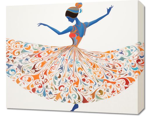 Obraz z serii abstrakcja zatytułowany Wirująca Balerina. Obraz przedstawia tancerkę w barwnym, rozłożystym stroju, który tworzy efekt wirującej sukni. Tancerka jest przedstawiona w dynamicznej pozie tanecznej, z rękami delikatnie uniesionymi. Suknia jest zdobiona bogatym, ornamentowym wzorem w ciepłych odcieniach pomarańczy, czerwieni, niebieskiego i kremu, które nadają jej lekkości i elegancji. Stylizacja postaci i wzory na sukni mogą nawiązywać do tradycyjnych strojów tanecznych lub folklorystycznych, a cała kompozycja przypomina sztukę w stylu Art Nouveau. Obraz ten wprowadza atmosferę radości i świętowania, doskonale nadając się do przestrzeni kulturalnych, sal tanecznych, teatrów lub jako wyrafinowana dekoracja w domowych wnętrzach.