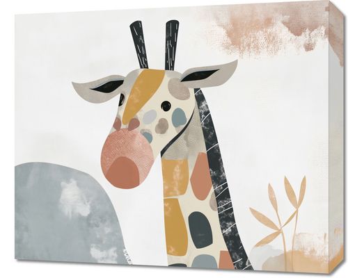 Obraz z serii wnętrza zatytułowany zatytułowany Żyrafa Bambino przedstawia stylizowany wizerunek żyrafy, którego cechy zostały zredukowane do prostych, geometrycznych kształtów i bloków pastelowych barw. Delikatne tekstury i ciepłe odcienie tworzą harmonijną kompozycję, która przyciąga wzrok i wprowadza do wnętrza spokój. Tło jest minimalistyczne z akcentami abstrakcyjnych form, co dodatkowo podkreśla nowoczesny charakter dzieła. Ten obraz będzie idealnym dodatkiem do przestrzeni o współczesnym designie, takich jak nowoczesne biura, kreatywne przestrzenie pracy, a także do pokojów dziecięcych lub wszędzie tam, gdzie chcemy dodać odrobinę zabawy i elegancji.