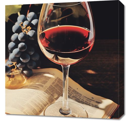 Obraz z serii wnętrza zatytułowany Bukiet Historii. Na tej zachęcającej ilustracji widzimy kieliszek czerwonego wina delikatnie spoczywający na otwartej stronie książki, z wyraźnym odbiciem na stronach. Obok kieliszka umieszczono grono dojrzałych winogron, a całość kompozycji znajduje się na ciemnym tle, co podkreśla bogactwo i głębię barw. Ten obraz oddaje przyjemność płynącą z połączenia relaksującej lektury z degustacją wybornego wina, idealny dla miłośników dobrych książek i enologii, świetnie sprawdzi się w domowych biblioteczkach, salonach degustacyjnych czy jako wyrafinowana dekoracja w winiarniach.