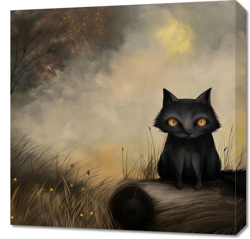 Obraz z serii abstrakcja zatytułowany Czarny Kot. Przedstawia on czarnego kota o hipnotyzujących, złotych oczach, siedzącego na polanie w ciepłych promieniach zachodzącego słońca. Drzewo o gołych gałęziach i delikatne światła odbijające się w tle tworzą atmosferę tajemniczości i spokoju. Złote i brązowe odcienie sceny, połączone z subtelnymi akcentami świetlnymi, nadają ilustracji uczucie ciepła i spokojnej zadumy.Ten obraz będzie doskonałym dodatkiem do wnętrz, które pragną wprowadzić element spokoju i kontemplacji, idealny do salonu, sypialni czy gabinetu. Zapewnia on poczucie towarzystwa i spokoju, wprowadzając do pomieszczenia ciepło i urok wieczornej aury.
