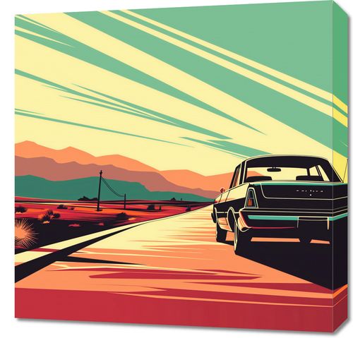 Obraz z serii pop art zatytułowany Droga przez Pustynię. Obraz przedstawia vintage samochód, prawdopodobnie model z lat 60., zaparkowany na pustynnej drodze z widokiem na zachód słońca. Złote i ciepłe odcienie nieba kontrastują z głębokimi cieniami pustyni, dodając głębi i dramatyzmu kompozycji. Design nawiązuje do złotej ery amerykańskich podróży samochodowych, przypominając o wolności i odkrywaniu nieznanych zakątków kraju. Idealnie sprawdzi się jako dekoracja w przestrzeniach inspirowanych vintage, takich jak retro kawiarnie, salony gier, domowe biblioteki, a także jako centralny punkt w salonie dla miłośników stylu mid-century modern.