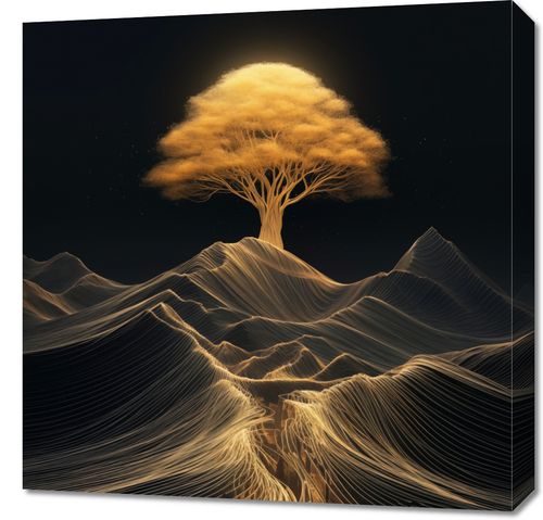Obraz z serii abstrakcja zatytułowany Drzewo Energii. Przedstawia on hipnotyzujący widok drzewa, którego korony i korzenie są ukazane jako sieć płynących linii światła, symbolizujących życie i energię. Kontrastujące z ciemnym niebem, linie świetlne tworzą efekt wizualny przypominający połączenie natury z energią. Dzieło to łączy w sobie piękno naturalnych form z abstrakcyjnym wyrazem, nadając mu głębię i metaforyczne znaczenie. Obraz ten jest idealnym wyborem dla przestrzeni, które pragną wprowadzić elementy inspirujące do refleksji nad życiem, naturą i jej niewidzialnymi więziami.