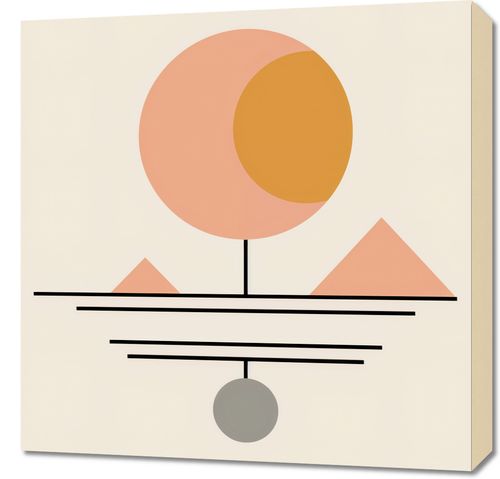 Obraz z serii boho zatytułowany Geometryczna Utopia prezentuje stylizowaną scenę o charakterze abstrakcyjnym, gdzie geometryczne formy współgrają, tworząc spójną i uproszczoną kompozycję. W centrum znajduje się duże, okrągłe słońce w kolorze bladego pomarańcza, z mniejszym, pełnym kołem w odcieniu głębokiego złota, które symbolizujące światło. Pod słońcem ciągnie się poziomy, czarny trzon, z którego wychodzą trzy poziome linie, sugerujące horyzont. Poniżej środka kompozycji, zawieszone na czarnym trzonie, znajduje się szare koło, przypominające zawieszony obiekt lub planetę. W tle widoczne są dwie proste, różowe piramidy, które nadają głębi i perspektywy całości. Obraz oddaje minimalistyczne piękno i jest przykładem sztuki współczesnej, która wykorzystuje redukcję formy do wyrażenia estetyki i spokoju.