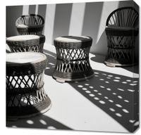 Obraz z serii wnętrza zatytułowany Gra Świateł to stylowa, monochromatyczna fotografia, która oddaje estetykę współczesnego designu. Na fotografii widzimy zestaw eleganckich, plecionych stołków z rattanu ustawionych na tle geometrycznych cieni. Ostre linie cieni przełamują okrągłe kształty mebli, tworząc fascynującą kompozycję pełną kontrastów. Białe siedziska stołków pięknie kontrastują z ciemniejszymi elementami, a gra światła i cienia nadaje scenie trójwymiarowość i teksturę. Obraz ten będzie doskonały dla miłośników minimalistycznych wnętrz, a także dla osób poszukujących elementu dekoracyjnego, który wprowadzi do pomieszczenia nowoczesny i artystyczny akcent. Idealny do nowoczesnych przestrzeni mieszkalnych, biur, kawiarni lub galerii sztuki.