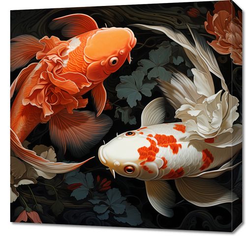 Obraz z serii motywy wschodnie zatytułowany Harmonijny Taniec to arcydzieło, które wyraża subtelność i równowagę przez harmonijne współistnienie natury i sztuki. Dwie ryby koi, jedna w odcieniach płomiennego pomarańczu, druga w pastelowych barwach kremu z akcentami czerwieni, są przedstawione w eleganckim tańcu, który jest tak płynny i gracji jak ruchy baletnicy. Ich delikatne płetwy przypominają falujące tkaniny, unoszące się w wodnym balecie, otoczone przez misternie malowane kwiaty, które dodają całości organicznej głębi. To zmysłowe i prowokujące do refleksji dzieło, które doskonale uzupełni każde wyrafinowane wnętrze, od stylowych kawiarni po intymne przestrzenie prywatne, gdzie design łączy się z naturalnym pięknem.