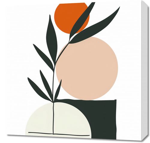 Obraz z serii boho zatytułowany Kompozycja Natury. Grafika łączy proste formy geometryczne z elementami przyrody, tworząc obraz, który jest jednocześnie nowoczesny i organiczny. Zestawienie gładkich, zaokrąglonych kształtów z ostrymi, ciemnymi liśćmi wprowadza wizualne napięcie, a pomarańczowa kula na wierzchołku gałązki przypomina zachodzące słońce lub soczysty owoc. Palecie barw dominują stonowane odcienie, które razem tworzą kojącą i zrelaksowaną atmosferę.Dzieło to doskonale sprawdzi się w przestrzeniach, które aspirują do stworzenia spokojnego i zbalansowanego wnętrza, takich jak jadalnie, poczekalnie lub pokoje relaksacyjne. Może także pełnić funkcję spajającą w pomieszczeniach z elementami zielonymi, takimi jak domowe ogrody zimowe czy salony w stylu eko.