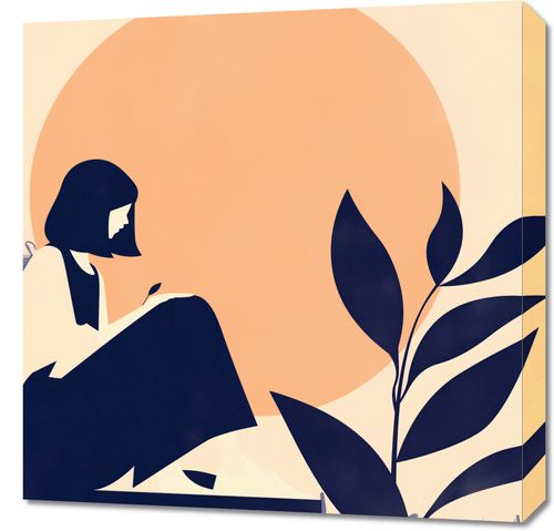 Obraz z serii minimalistyczne zatytułowany Kontemplacja. Ta delikatna grafika przedstawia sylwetkę kobiety w stanie kontemplacji na tle dużego, ciepłego, pomarańczowego słońca. Sylwetka jest otoczona przez proste, ale eleganckie czarne rośliny, co dodaje kompozycji spokojnego nastroju.Ten obraz jest idealny dla przestrzeni, które pragną wprowadzić momenty spokoju i refleksji. Będzie wspaniałym dodatkiem do sypialni, czytelni, kącików medytacyjnych czy nawet przestrzeni terapeutycznych.