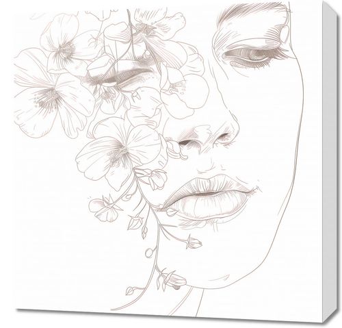 Obraz z serii wnętrza zatytułowany Kwitnąca Imersja przedstawia delikatny, linijny rysunek profilu kobiety, którego twarz częściowo zasłaniają i uzupełniają subtelne kwiaty. Delikatne linie twarzy kobiecej harmonizują z organicznymi kształtami roślin, sugerując jedność z naturą i subtelne piękno. Kwiaty wydają się być naturalnym przedłużeniem jej bytu, dodającym delikatności i eterycznego charakteru całej kompozycji. Ta minimalistyczna, ale wyrafinowana ilustracja emanuje spokojem i ukojeniem, idealna do przestrzeni medytacyjnych, salonów spa, lub jako elegancki element dekoracyjny w nowoczesnych wnętrzach.
