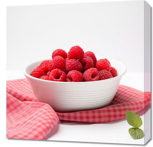 Obraz z serii wnętrza zatytułowany Lato w Misce. Na obrazie widnieje pełna misa soczystych, dojrzałych malin, które kontrastują swoją intensywną czerwienią z czystą bielą naczynia i tłem. Rozłożona obok misy czerwono-biała, kratka serwetka dodaje wiejskiego uroku, a pojedynczy listek mięty wprowadza świeży akcent. Ten obraz przyciąga wzrok swoją prostotą i elegancją, idealnie uchwycając esencję letniego sezonu i świeżości owoców. Doskonały do ożywienia kuchni, jadalni, a także jako element dekoracyjny w przestrzeniach, gdzie chce się wprowadzić nutę świeżości i naturalnego piękna. Zaprasza do celebracji zdrowego stylu życia i radości płynącej z prostych przyjemności.